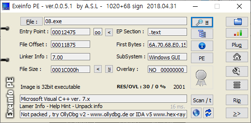 언패킹을 진행했으니 다시 ExeInfoPE를 확인해보자