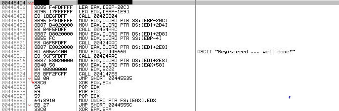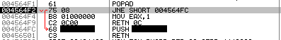 TADA! 이렇게 잘 POPAD 부분에 도착한 것을 볼 수 있다. 그리고 PUSH (Address) 후 RETN을 진행한 것으로 보아 PUSH해준 Address가 OEP인것을 알 수 있다. 그럼 우리의 첫번째 목표인 OEP는 구했고, 이제 등록 성공으로 분기하는 OPCODE를 찾으러 가보자. F8을 통해서 OEP로 진입해주자.