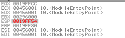 이러한 명령어이다. 이 때, Stack에 값을 대입하므로 Stack을 가르키는 ESP(Extended Stack Pointer)의 값이 변경될 것이다. 또한, PUSHAD로 범용 레지스터 값들을 저장한 후, 복구하기 위해서 다시 POPAD를 할 때, 스택의 값을 변경할 것이다. 이를 통해서 PUSHAD 이후 ESP값에 BP를 걸고 실행하면 POPAD 직후에 멈추게 될것이다. 한번 실험해보자.