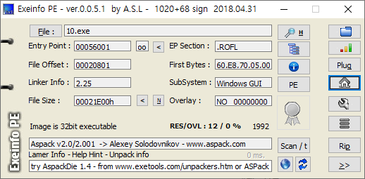 이번엔 익숙한 UPX가 아닌 생소한 Aspack이라는 패킹 툴이다. 하지만, 겁먹을거 없다. UPX와 언패킹 과정은 비슷하다.