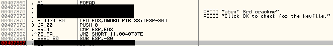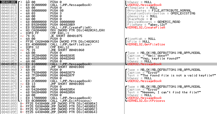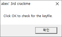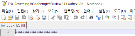 예상외로 간단했다. 처음 MessageBoxA 이후, "abex.l2c"라는 파일을 읽기 시도한다. 그 후, GetFileSize를 통해 파일 크기를 얻어 0x12와 비교하여 분기된다. 그럼 한번 abex.l2c라는 파일을 만들어보자. 그냥 a를 0x12만큼, 총 18번 썼다.