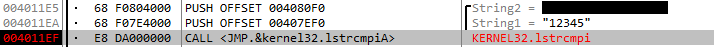 분기 조건 찾아보니 lstrcmpi로 비교하여 분기하므로 BP걸고 실행하여
