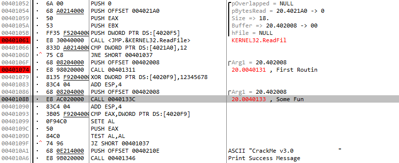 처음 ReadFile을 통해서 파일을 읽어온다. 그 후, 글자수가 0x12, 즉 18자인지 비교하므로 키파일의 크기는 18바이트여야한다. 그 후 함수와 비교를 통해 성공 문자열을 출력한다. 그럼 첫번째 Routine에 들어가보자.